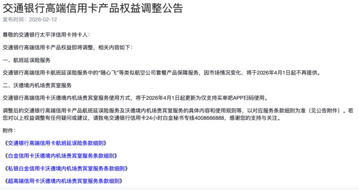 交通银行则针对高端信用卡权益进行调整。2月12日,该行信用卡中心发布《高端信用卡产品权益调整公告》,明确因市场情况变化,自2026年4月1日起,高端信用卡航班延误险服务中,针对“随心飞”等类似航空公司套餐产品的保障服务将不再提供;同时,高端信用卡沃德境内机场贵宾室服务的使用方式将更新,仅支持通过买单吧App扫码使用。