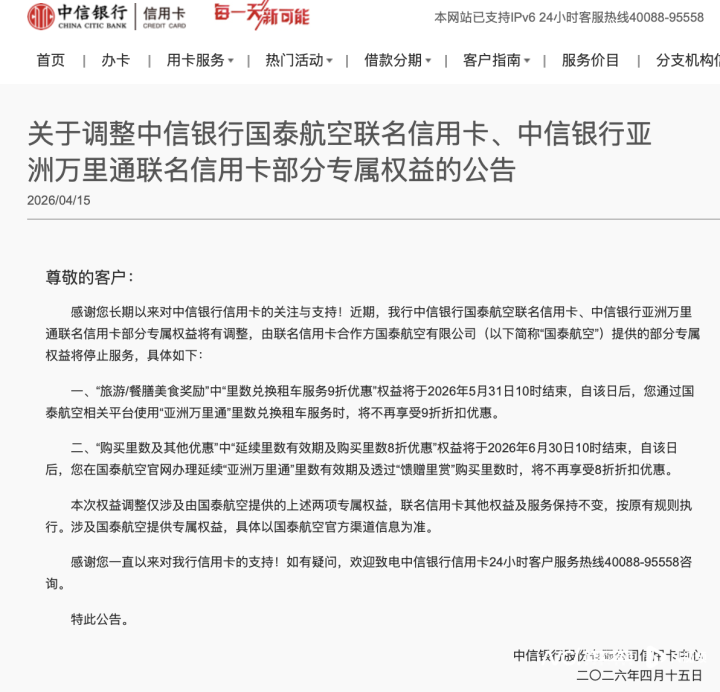 4月15日,中信银行信用卡中心发布公告,对中信银行国泰航空联名信用卡、中信银行亚洲万里通联名信用卡的部分专属权益进行调整。根据公告,合作方国泰航空提供的两项核心权益将陆续终止:“旅游/餐膳美食奖励”中的“里数兑换租车服务9折优惠”,将于2026年5月31日10时停止服务;“购买里数及其他优惠”中的“延续里数有效期及购买里数8折优惠”,将于2026年6月30日10时终止。