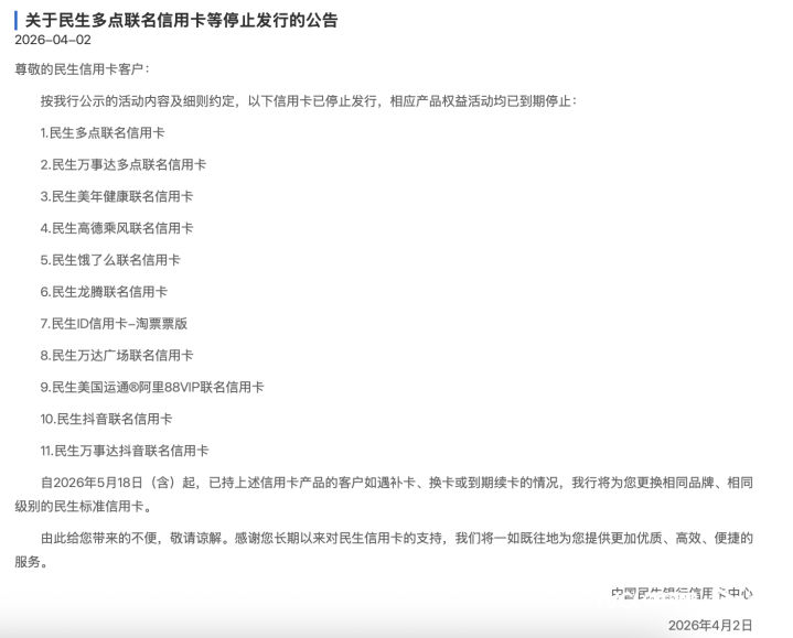 具体来看,4月2日,民生银行信用卡中心发布公告称,将停发民生多点联名信用卡、民生万事达多点联名信用卡等11款产品,其中多数为联名卡。公告明确,上述产品相关权益活动已全部到期终止,后续将为相关持卡人更换相同品牌、相同级别的民生标准信用卡,保障持卡人正常用卡权益。