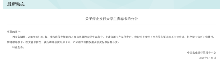 农业银行信用卡中心则在3月内两次发布停发公告:3月6日公告显示,将于2026年4月16日起停发天柱山信用卡;3月31日再次公告,定于2026年5月15日起,停发银联及万事达品牌的大学生青春卡,两次停发均以“业务调整”为由。